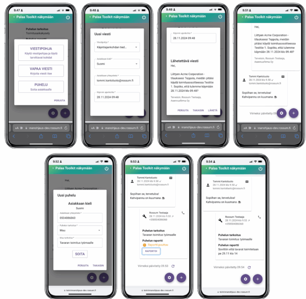 Työkalu mahdollistaa myös soittamisen, ja puhelun jälkeen järjestelmä pyytää kirjaamaan sovitut asiat tekstikenttään. Kaikista viesteistä ja puheluista tallentuu historiatiedot.