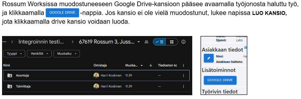 Worksissä on Drive-rajapinta, joka luo asiakaskansion työn luonnissa. Kansio-oikeudet jaetaan asentajille työn osoituksessa, ja työhön liitetyt kuvat päivittyvät automaattisesti Driveen.