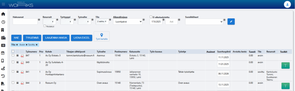 - Asennus- ja huoltotodistukset, mittapöytäkirjat, lisätyömääräimet sekä palautelomakkeet.