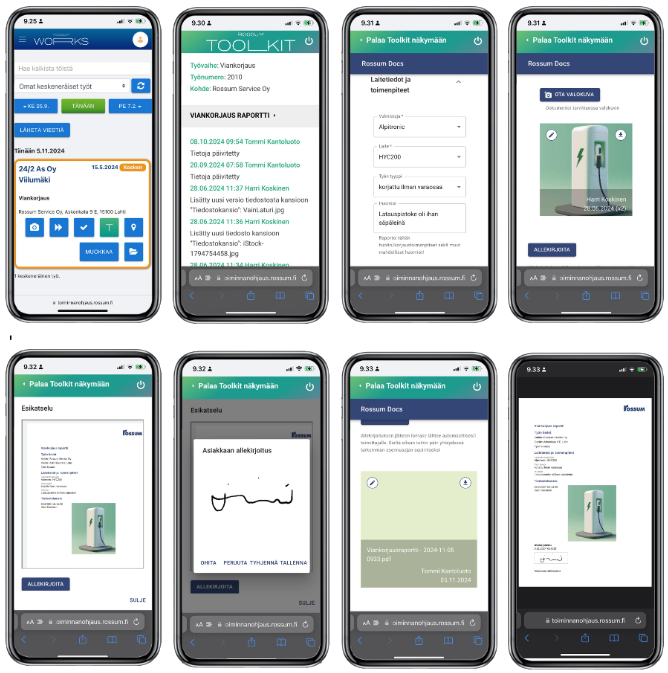 Tässä kuvasarjassa on esimerkki viankorjausraportin täyttämisestä. Rossum Worksin työmääräimellä on Toolkit-painike (T), jota klikkaamalla avautuu viankorjausraportti. Asentaja täyttää lomakkeen, liittää tarvittavat valokuvat ja allekirjoittaa sen. Allekirjoituksen jälkeen vastaanottaja saa sähköpostin, jossa on allekirjoitettu lomake.