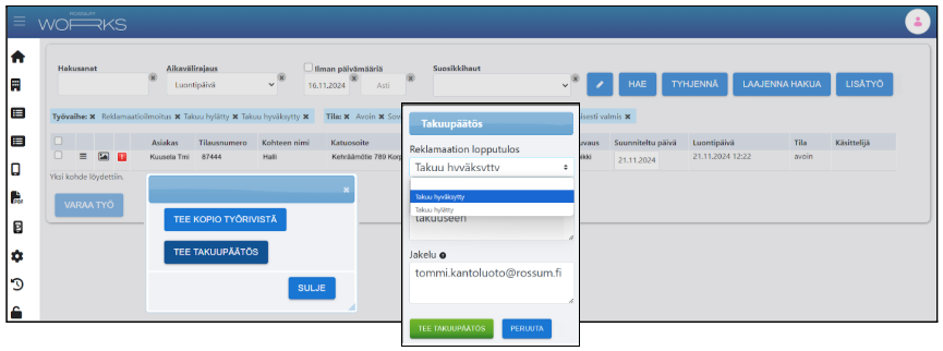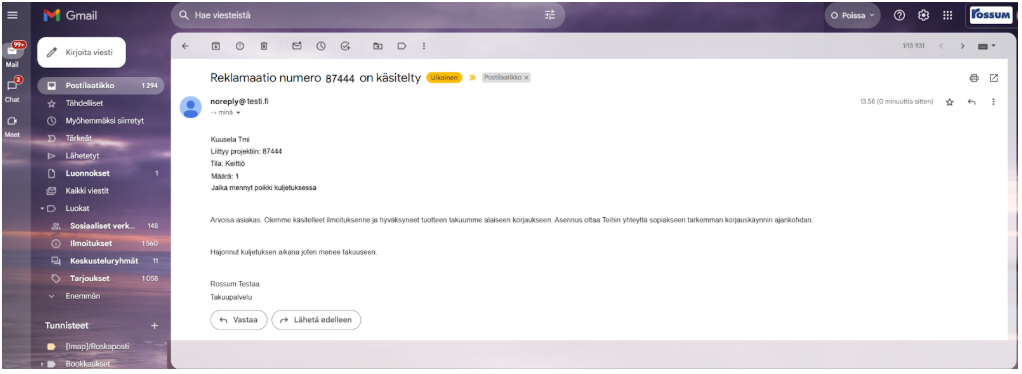 Kun reklamaatiotyö luodaan, järjestelmä lähettää sähköposti-ilmoituksen sekä toimittajayritykselle että asiakkaalle. Käsittelyn aikana voidaan määrittää, kuuluuko reklamaatio takuun piiriin vai ei.
