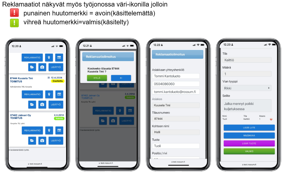 Reklamaatiot voidaan luoda suoraan asentajan toimesta. Käsittelijä näkee ne työjonossa värikoodilla, ja asiakas saa automaattiset ilmoitukset käsittelyn etenemisestä.