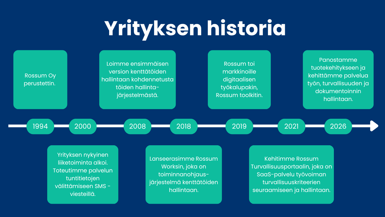 Rossumin tarina alkaa vuodesta 1994, jolloin yritys perustettiin alun perin robotiikkaan liittyvää toimintaa varten. Myös yrityksen nimi juontaa juurensa tästä vaiheesta. Yrityksen nykyinen liiketoiminta sai alkunsa vähän myöhemmin, vuonna 2000, kun toteutimme ohjelmistopalvelun töiden raportointiin ja ohjaukseen. Vuonna 2008 julkaisimme ensimmäisen version kenttätyön hallintaan suunnatusta järjestelmästä.